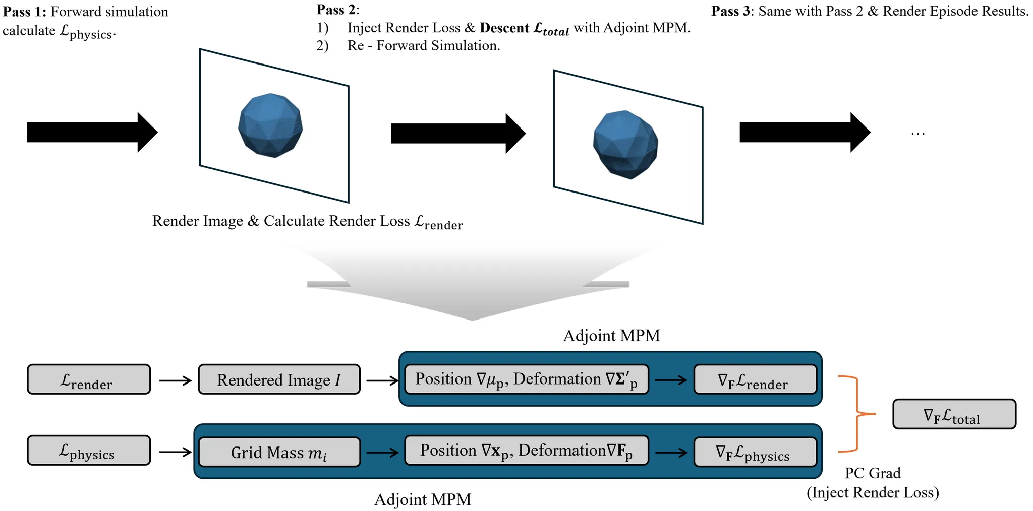 In parallel, physics gradients from the grid‑mass objective are obtained via adjoint MPM.